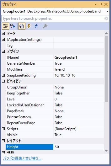 「GroupFooter1」のプロパティから「Me.GroupFooter1.HeightF = 50.0!」を設定します。