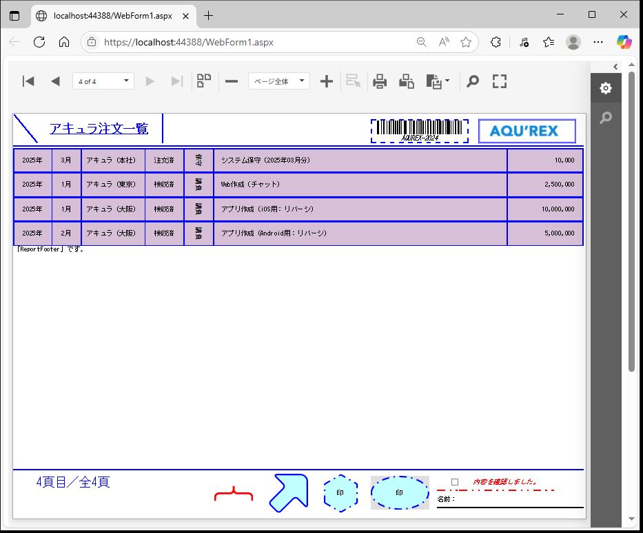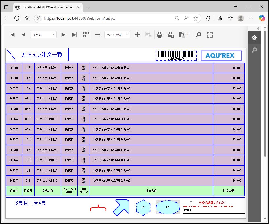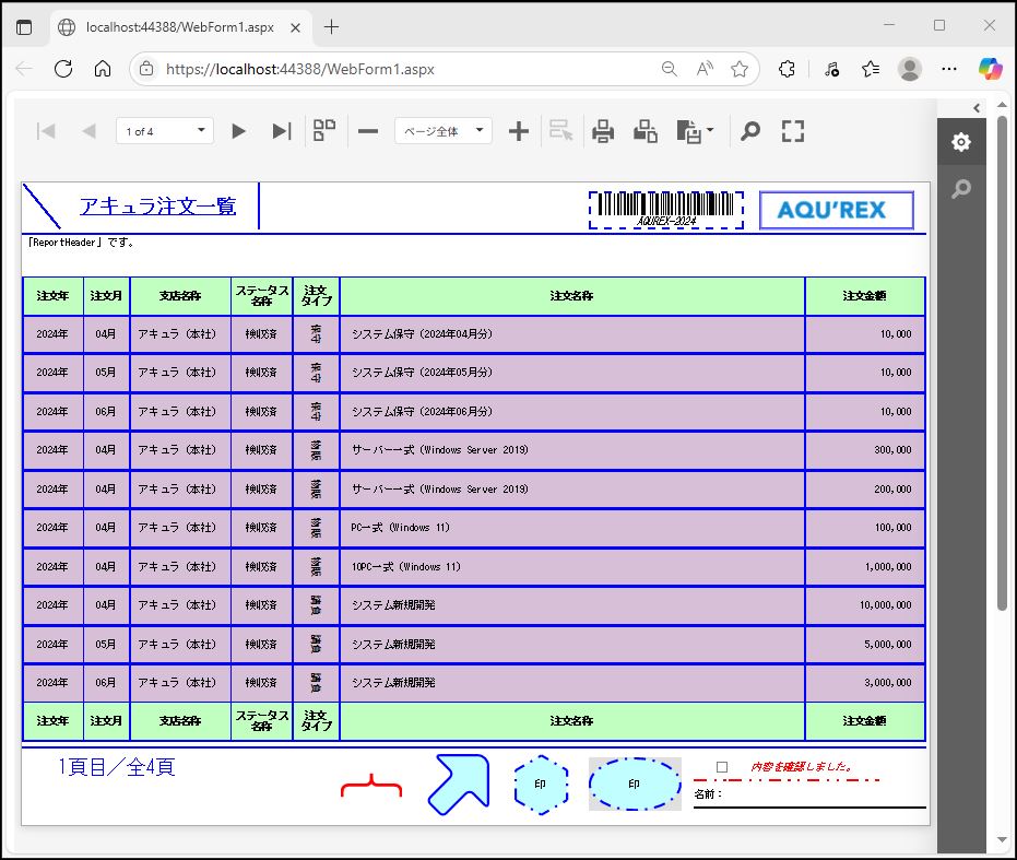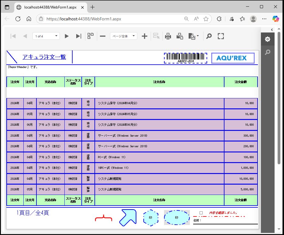 DevExpress での一覧、帳票等のレポート(ASPxWebDocumentViewer)の「GroupHeader」追加設定のサンプルです。