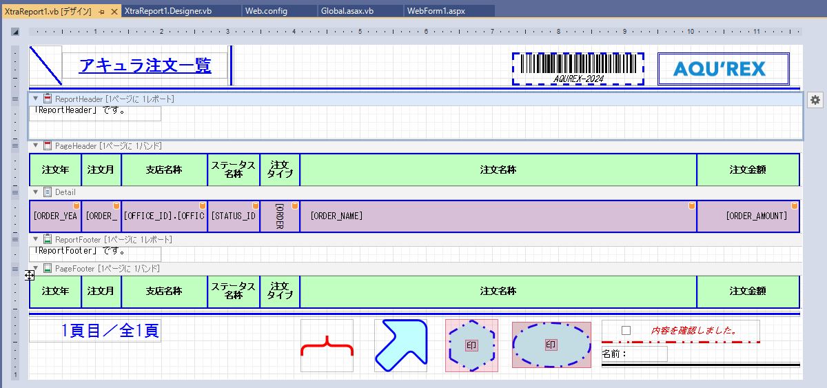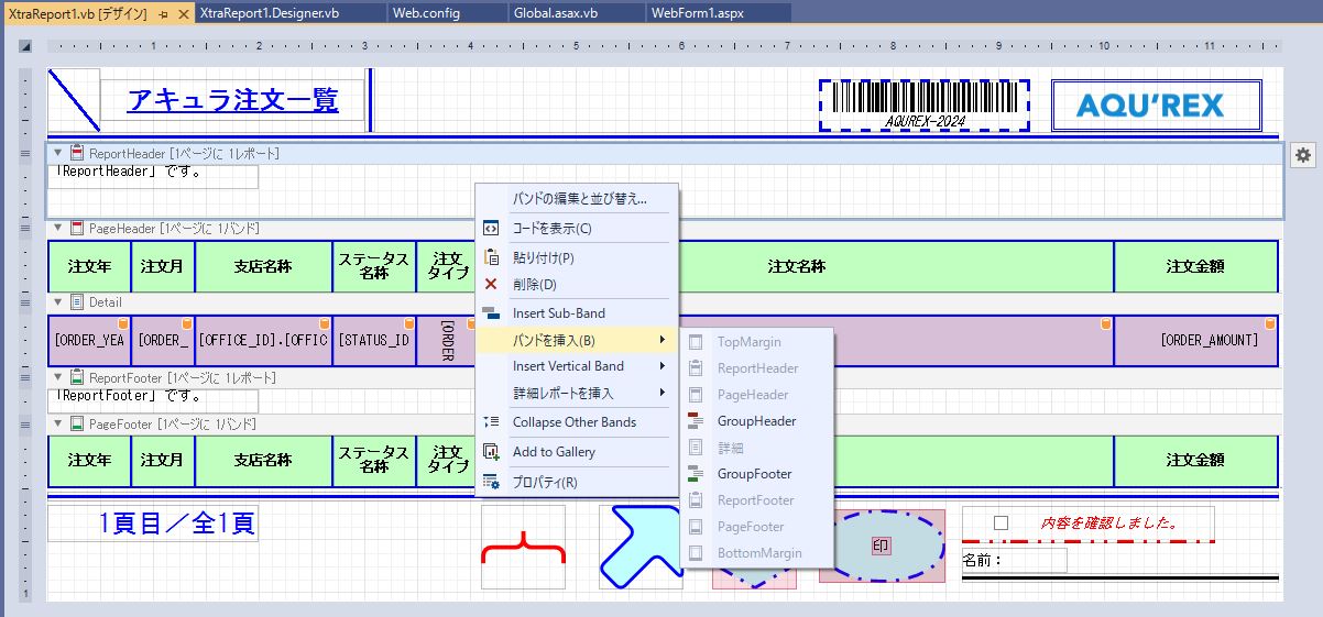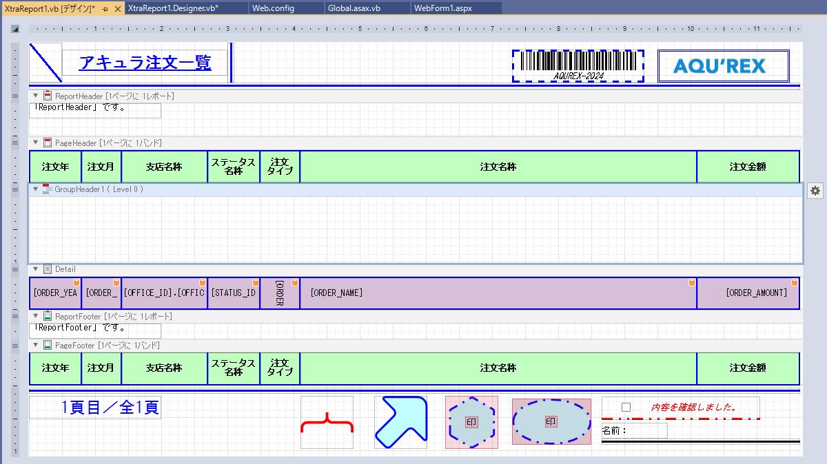 無事、一覧、帳票等のレポート(ASPxWebDocumentViewer)の「GroupHeader」追加設定が出来ました。