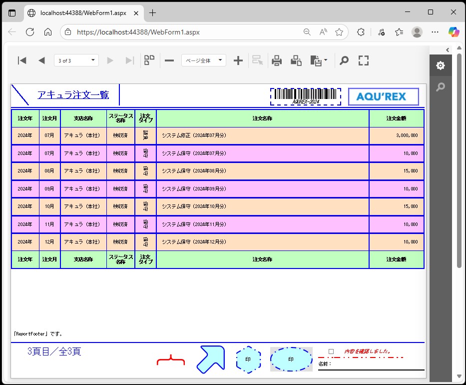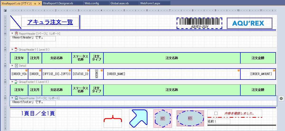 DevExpress での一覧、帳票等のレポート(ASPxWebDocumentViewer)の「ReportFooter」下段位置設定のサンプルです。