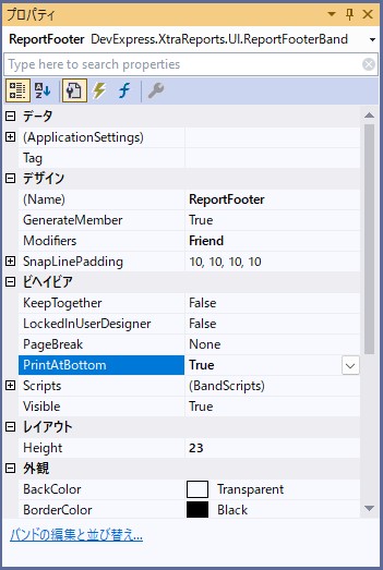 「ReportFooter」プロパティから「Me.ReportFooter.PrintAtBottom = True」を設定します。
