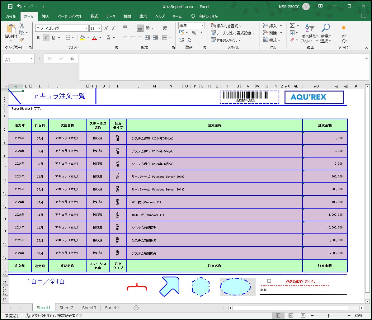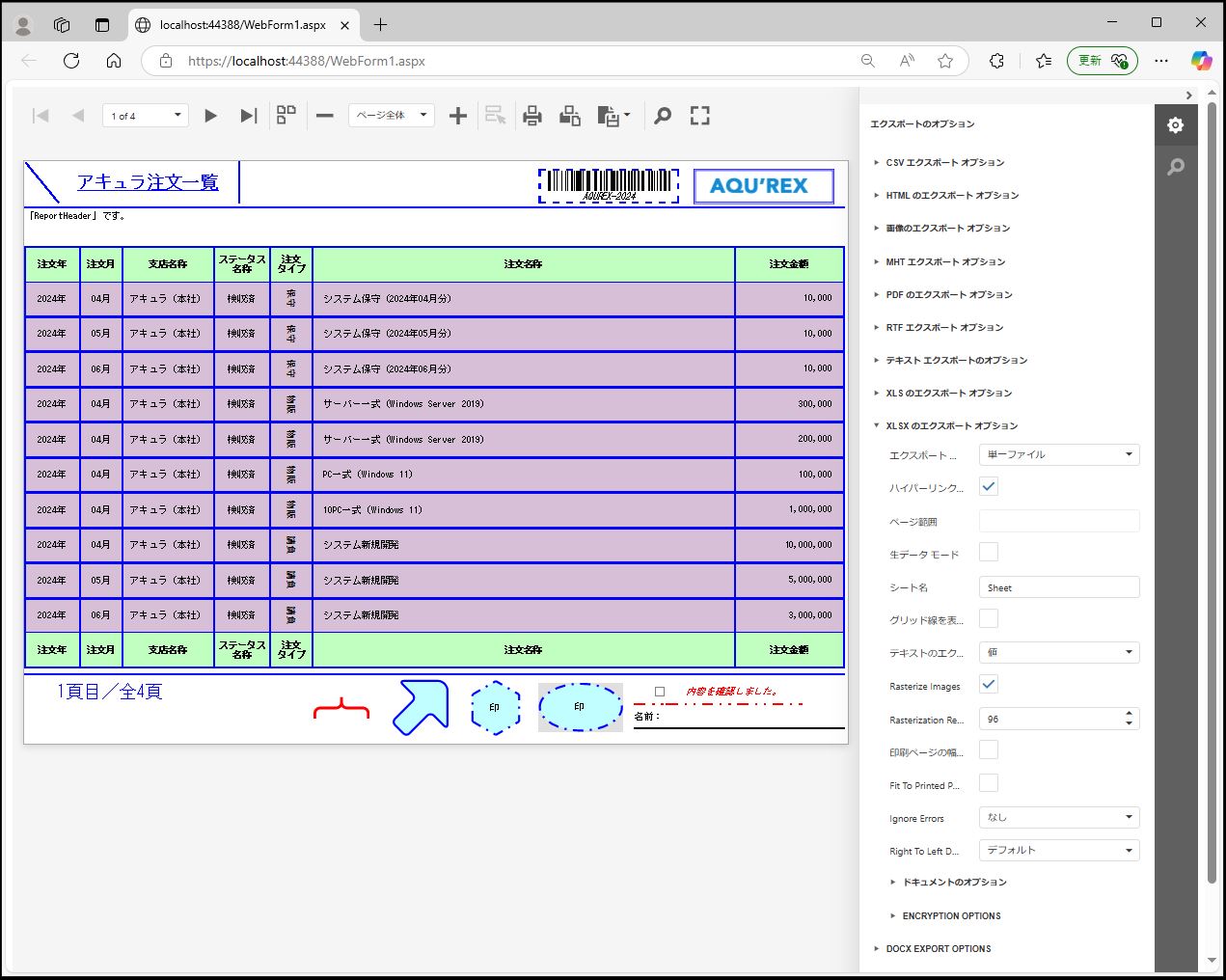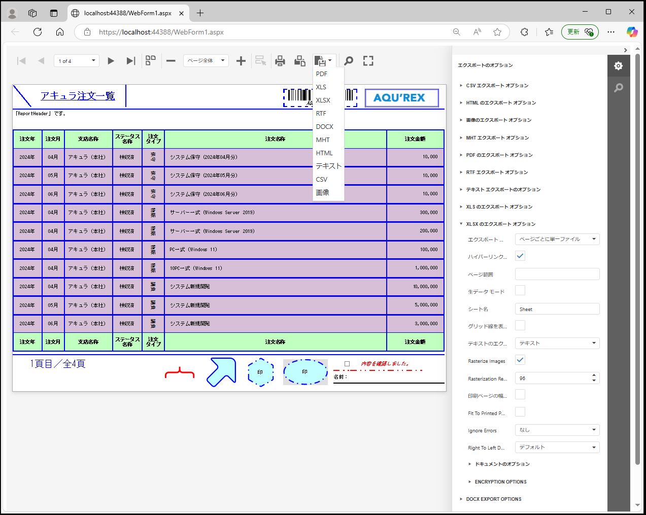 無事、一覧、帳票等のレポート(ASPxWebDocumentViewer)のエクセル(XLSX)のテキスト出力設定が出来ました。