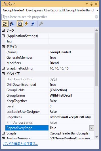 「GroupHeader1」のプロパティから「Me.GroupHeader1.RepeatEveryPage = True」を設定します。