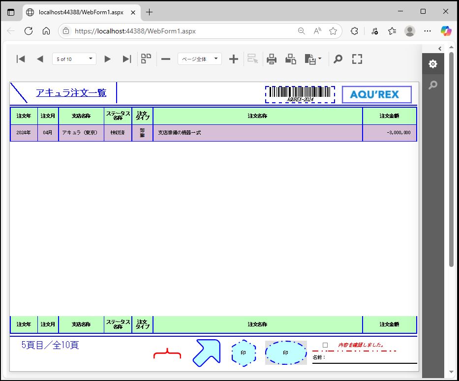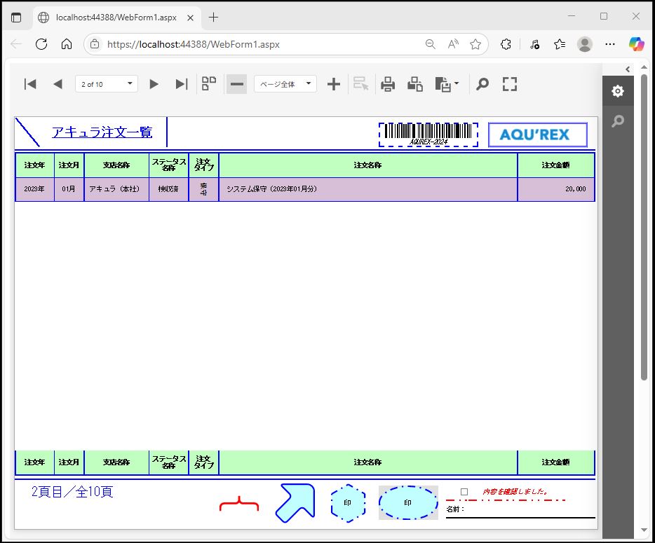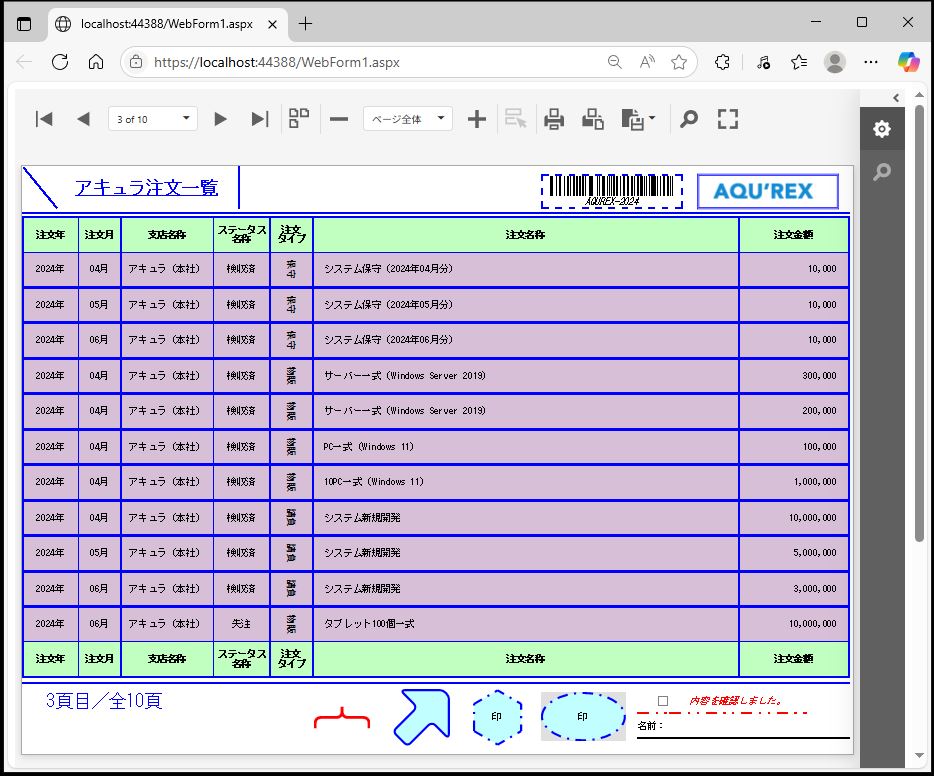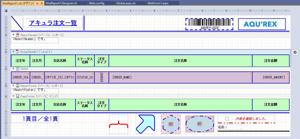 DevExpress での一覧、帳票等のレポート(ASPxWebDocumentViewer)のグループ改ページ条件設定のサンプルです。