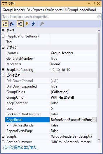 「GroupHeader1」のプロパティから「Me.GroupHeader1.PageBreak =