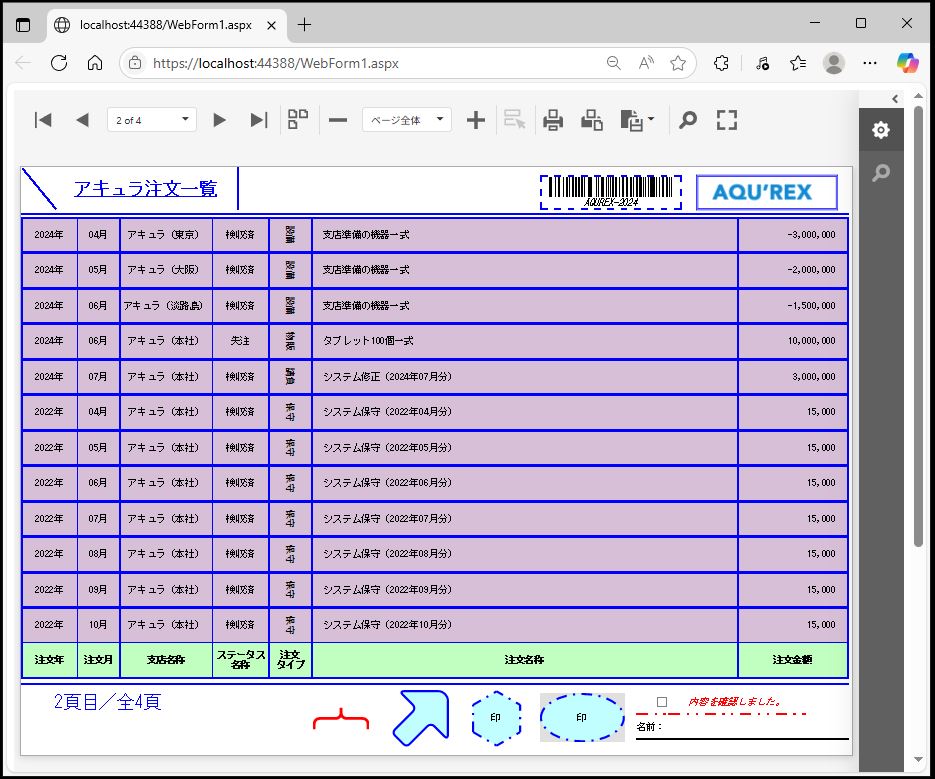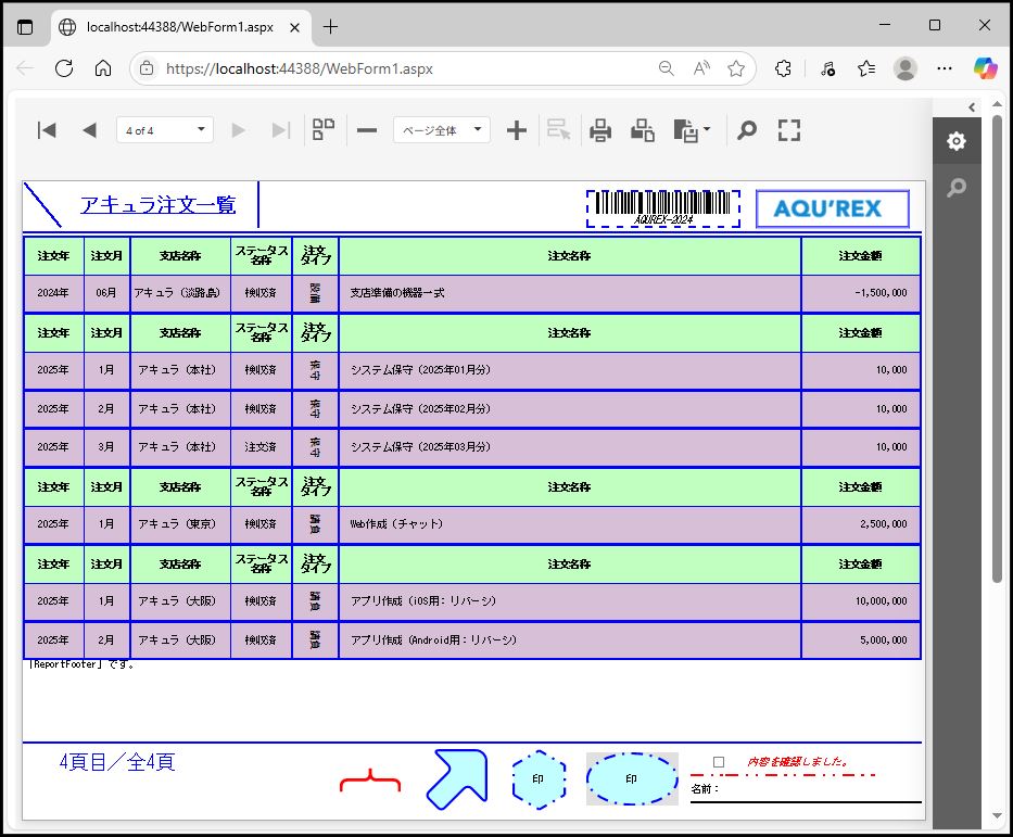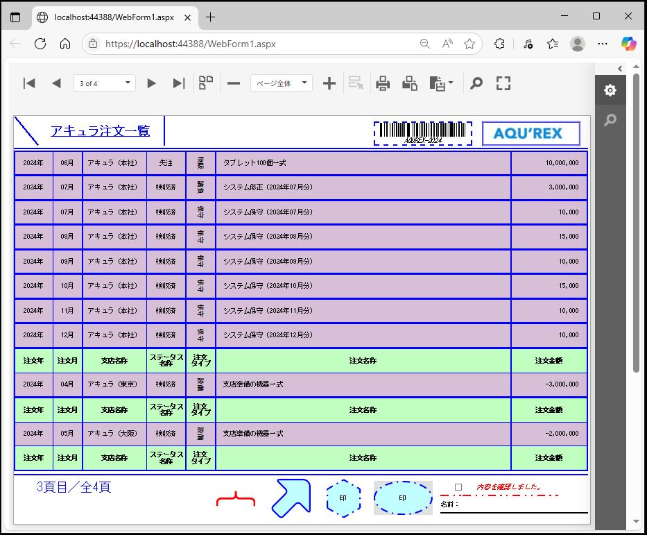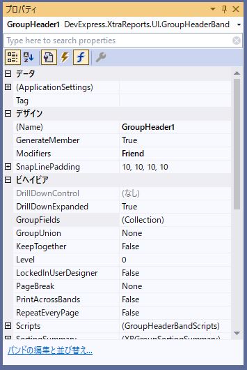 DevExpress での一覧、帳票等のレポート(ASPxWebDocumentViewer)のグループ設定のサンプルです。
