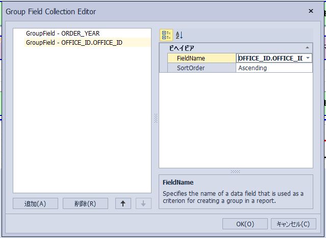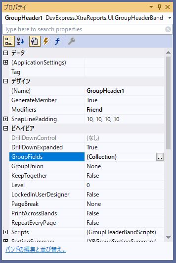 「GroupHeader1」のプロパティから「GroupFields」項目を選択します。