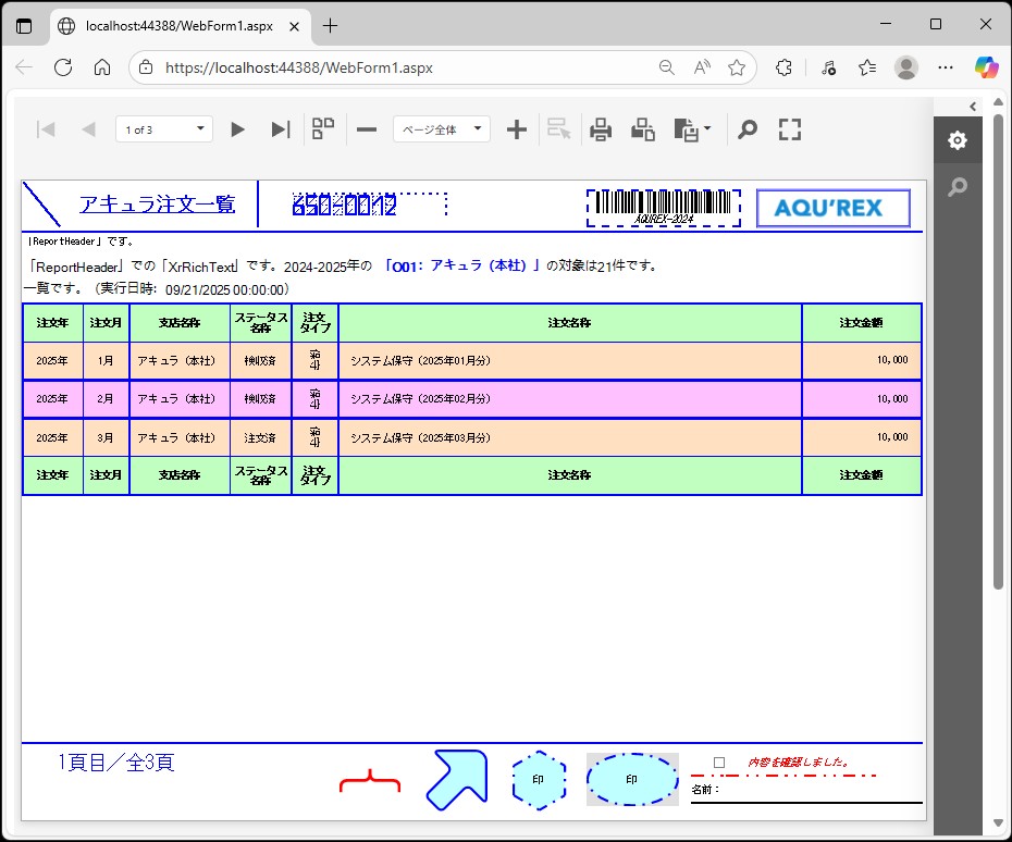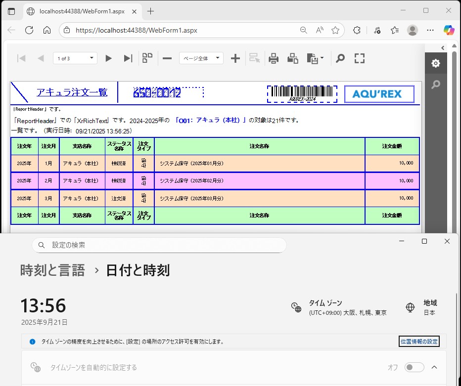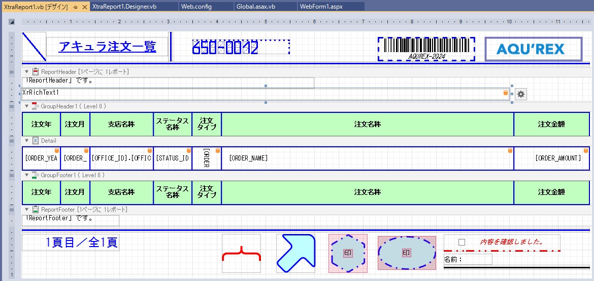 DevExpress での一覧、帳票等のレポート(ASPxWebDocumentViewer)のリッチテキスト情報(XRRichText)のテキストにシステム日時設定のサンプルです。