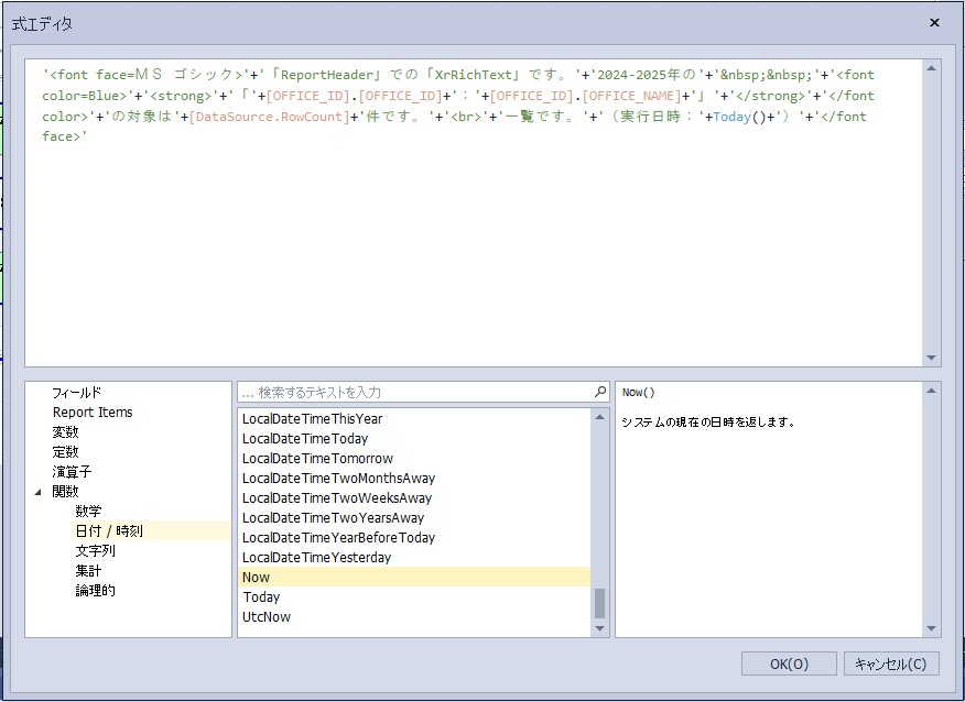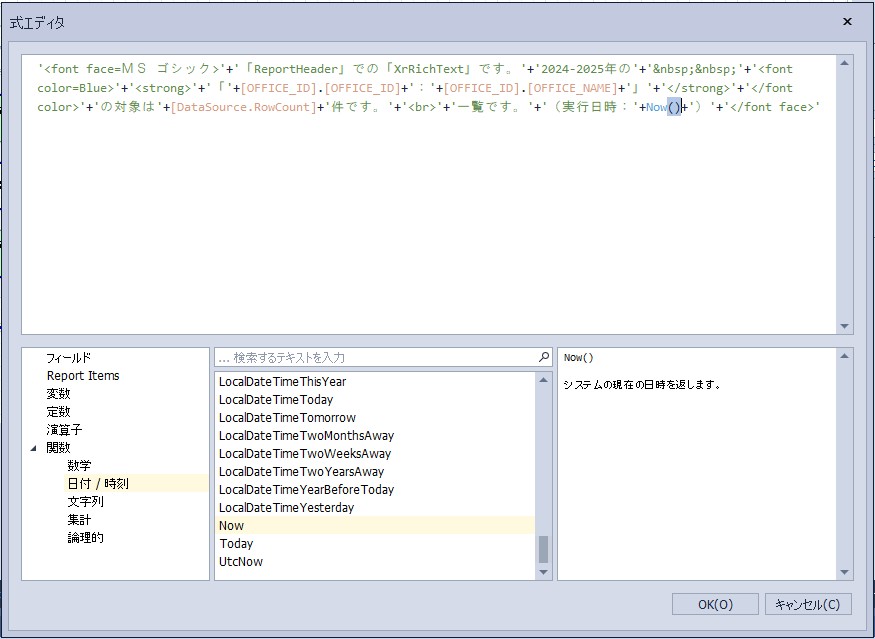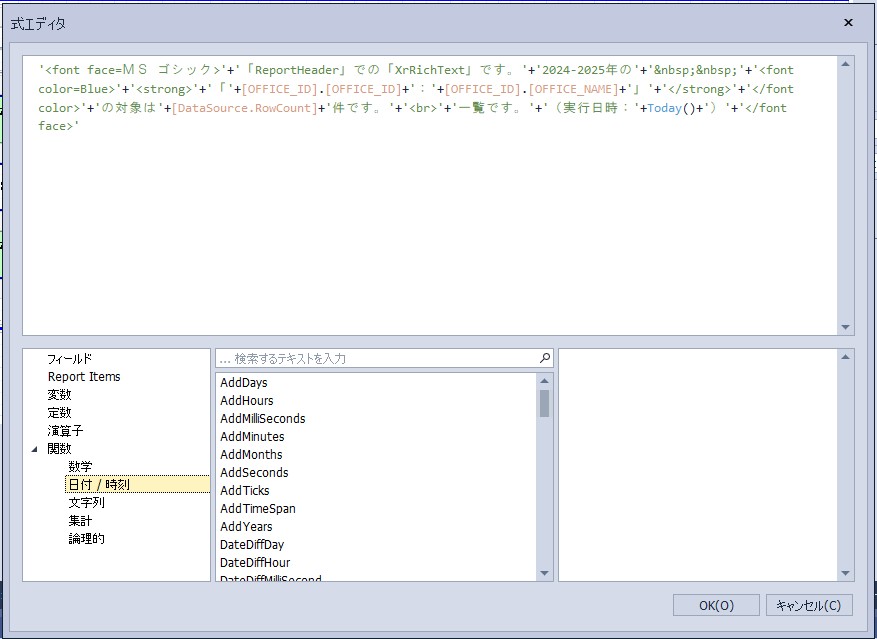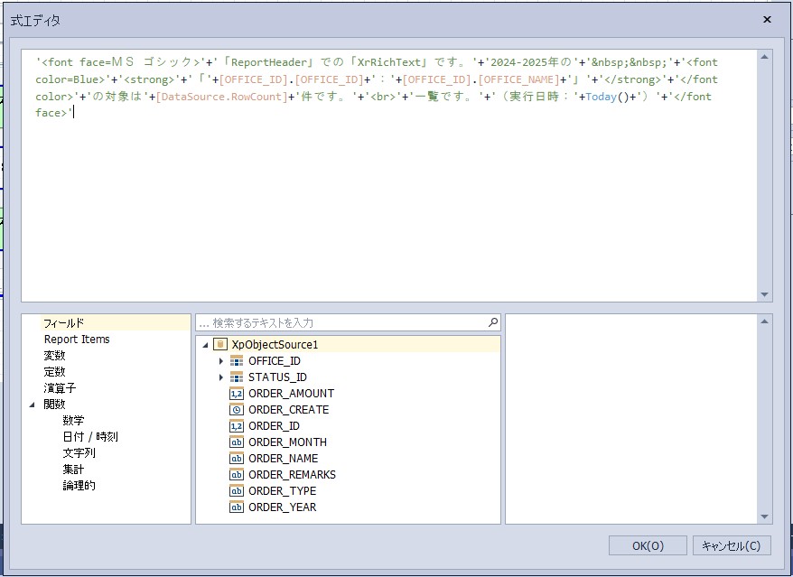 設定内容:'<font face=MS ゴシック>’+’「ReportHeader」での「XrRichText」です。’+’2024-2025年の’+’&nbsp;&nbsp;’+'<font color=Blue>’+'<strong>’+’「’+[OFFICE_ID].[OFFICE_ID]+’:’+[OFFICE_ID].[OFFICE_NAME]+’」’+'</strong>’+'</font color>’+’の対象は’+[DataSource.RowCount]+’件です。’+'<br>’+’一覧です。’+’(実行日時:’+Now()+’)’+'</font face>’