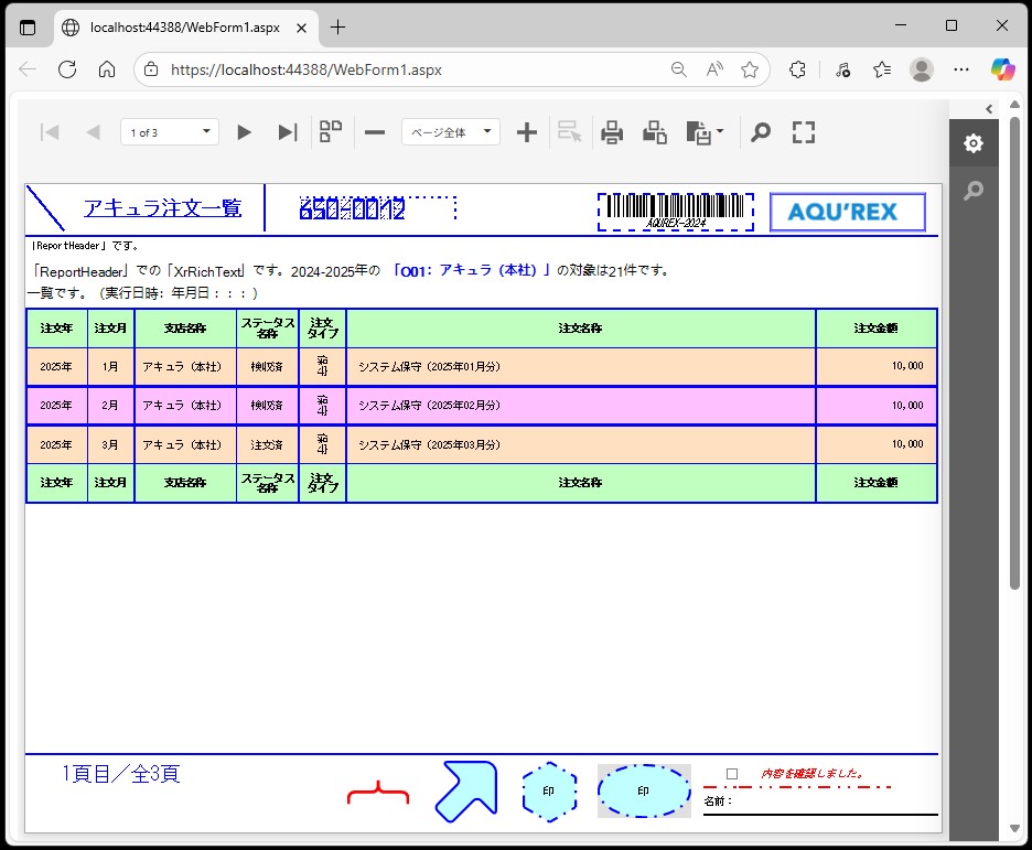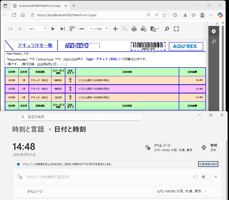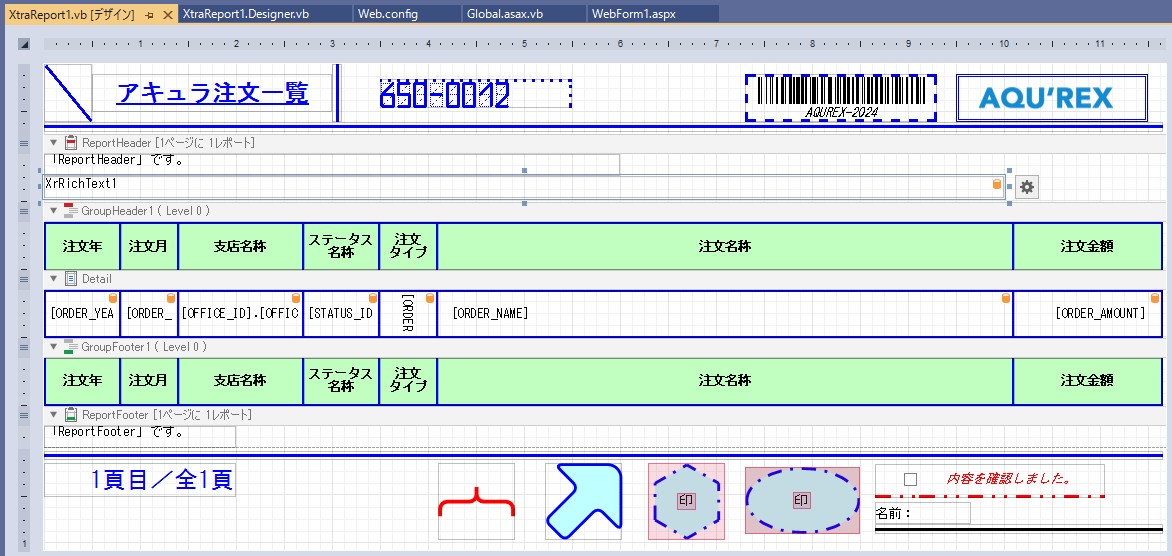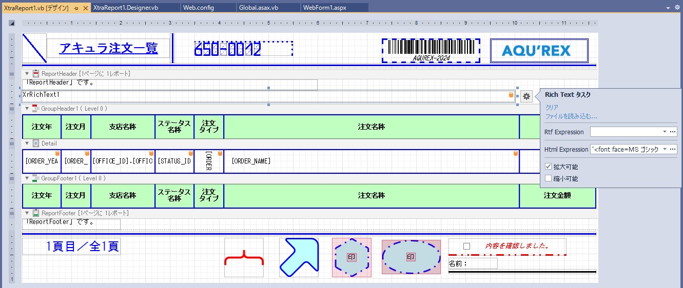 DevExpress での一覧、帳票等のレポート(ASPxWebDocumentViewer)のリッチテキスト情報(XRRichText)のテキストにシステム日付(カスタム)設定のサンプルです。