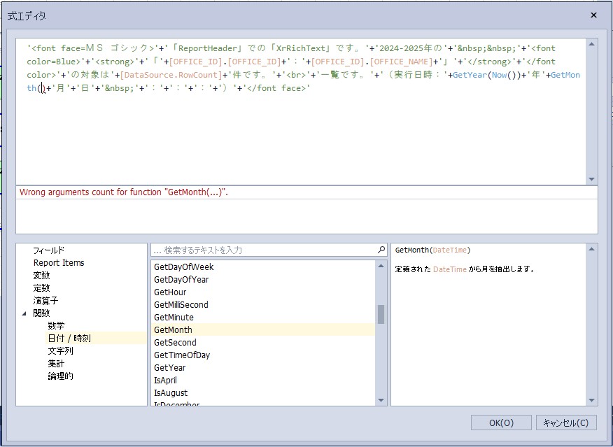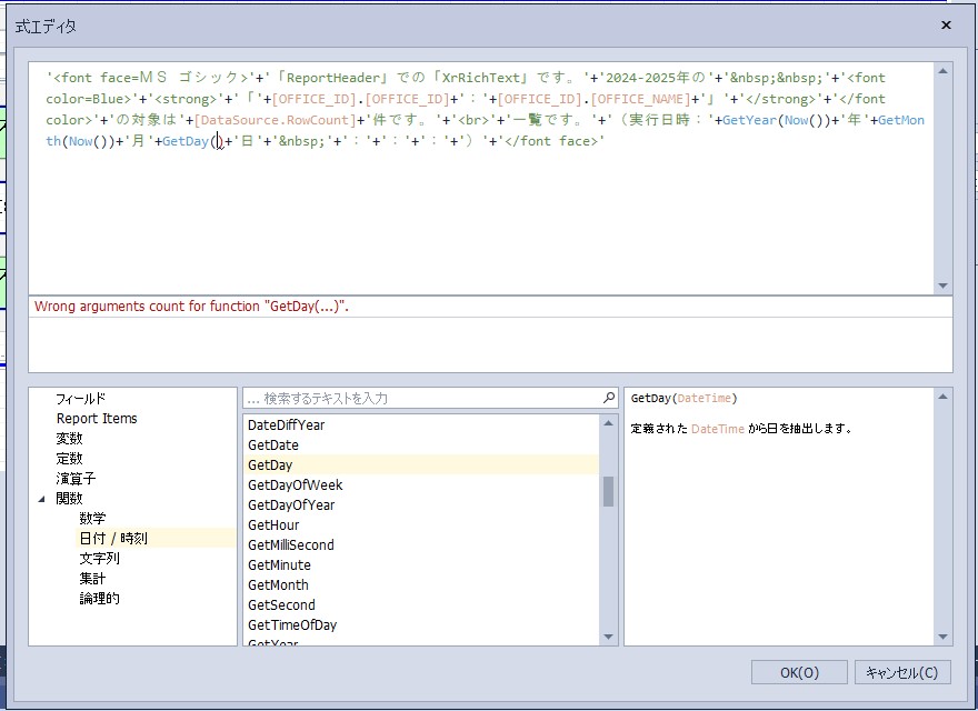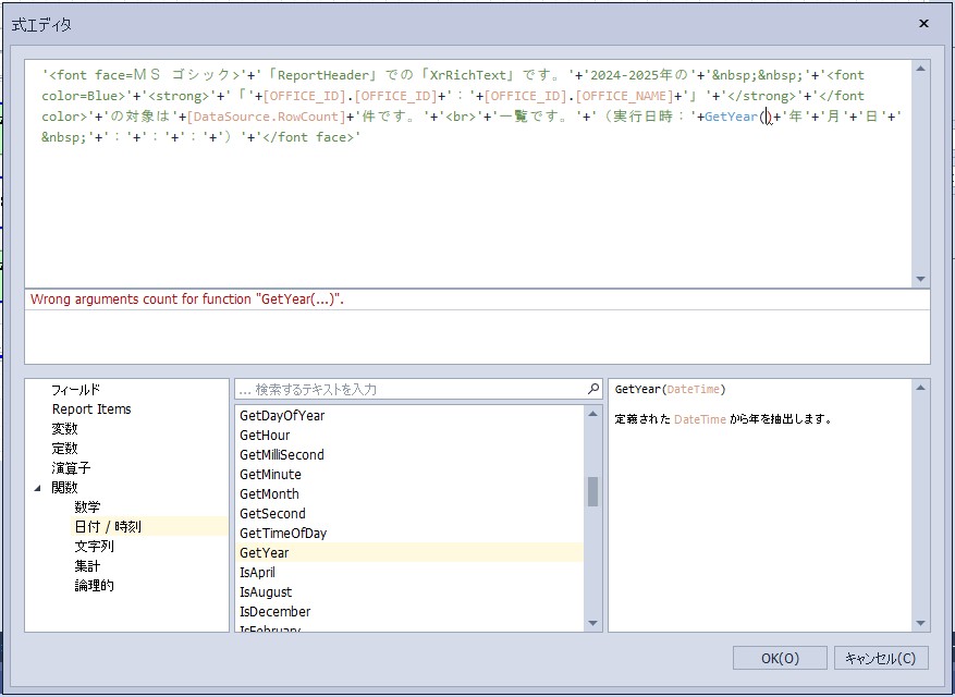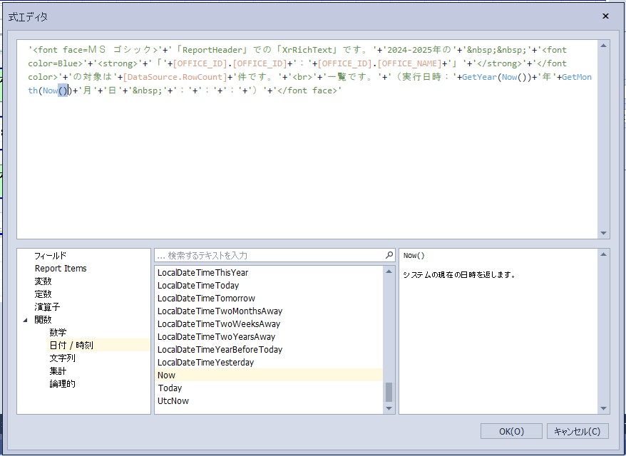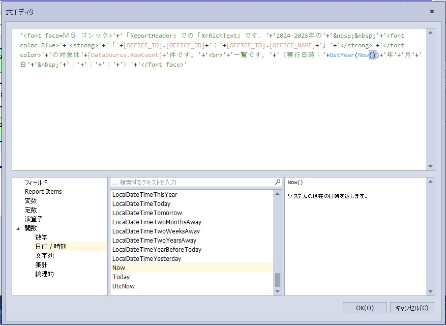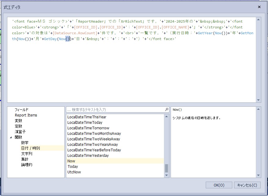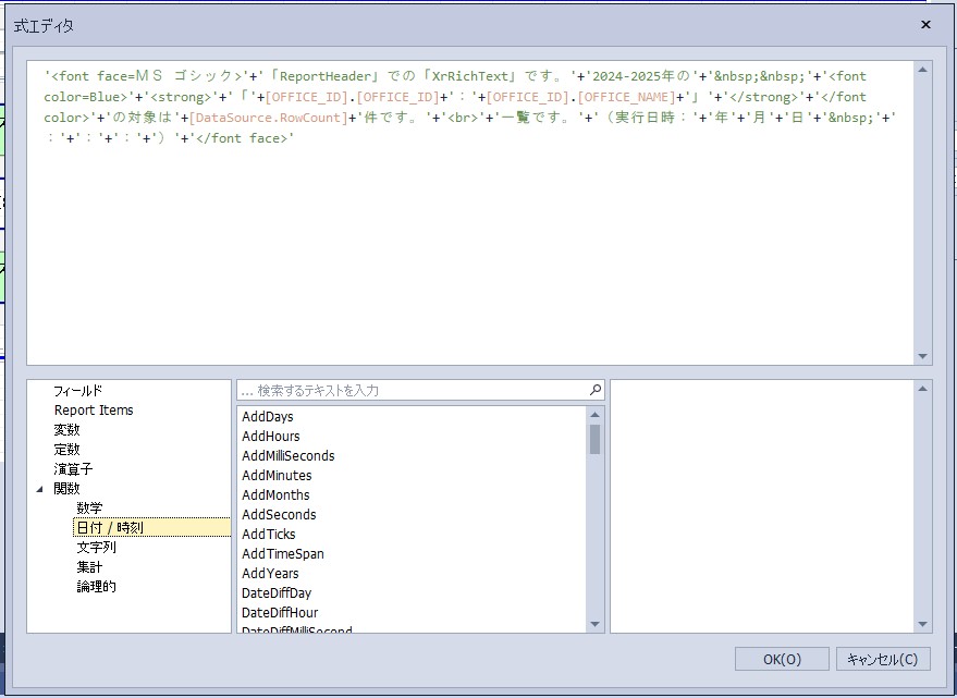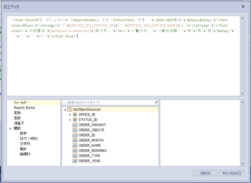 設定内容:'<font face=MS ゴシック>’+’「ReportHeader」での「XrRichText」です。’+’2024-2025年の’+’ ’+'<font color=Blue>’+'<strong>’+’「’+[OFFICE_ID].[OFFICE_ID]+’:’+[OFFICE_ID].[OFFICE_NAME]+’」’+'</strong>’+'</font color>’+’の対象は’+[DataSource.RowCount]+’件です。’+'<br>’+’一覧です。’+’(実行日時:’+Now()+’)’+'</font face>’