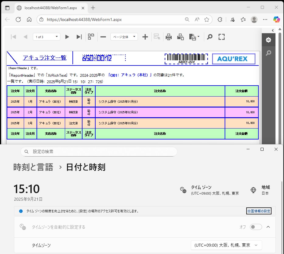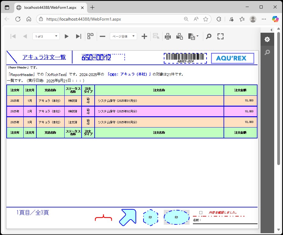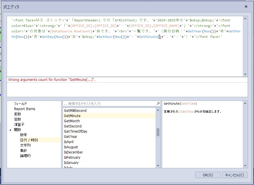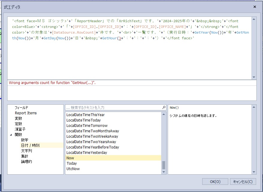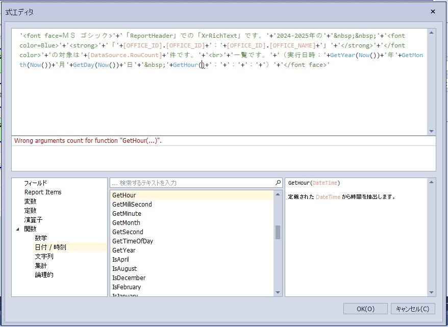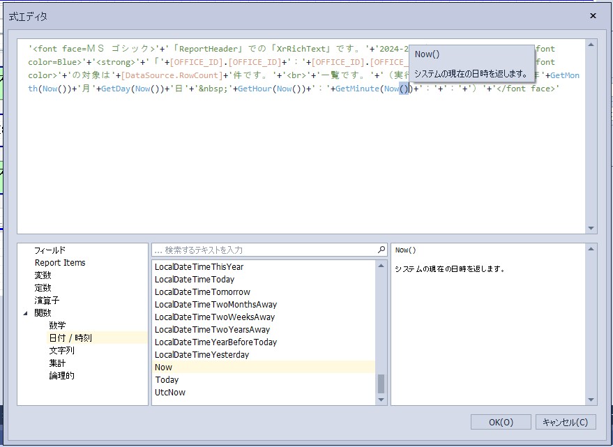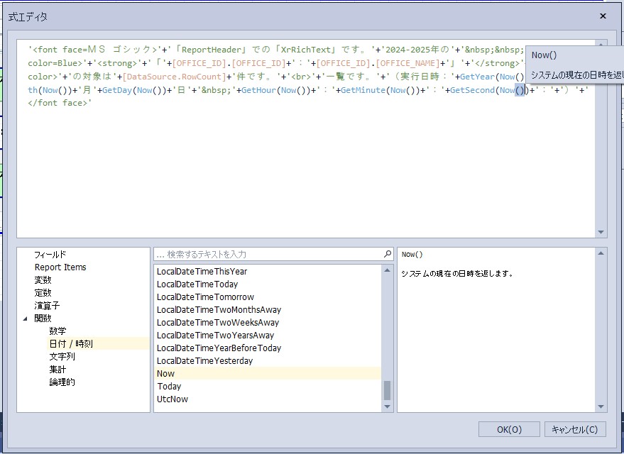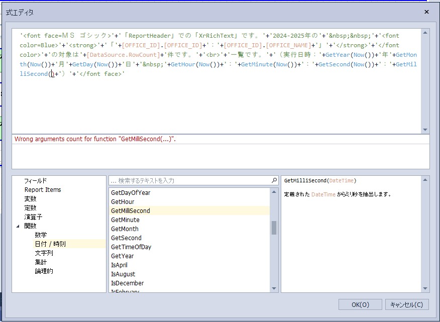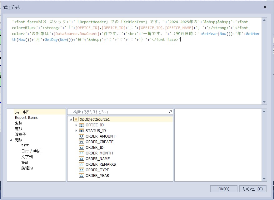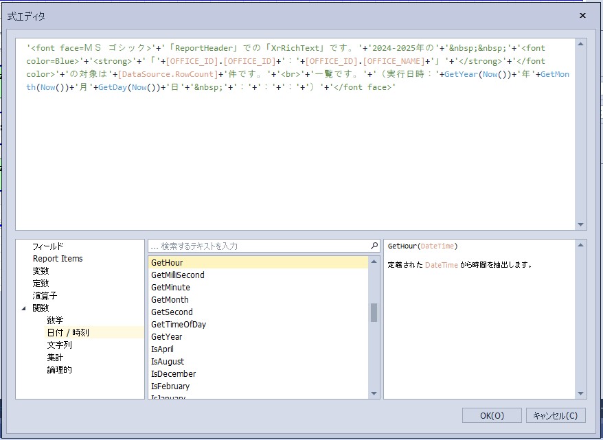 設定内容:'<font face=MS ゴシック>’+’「ReportHeader」での「XrRichText」です。’+’2024-2025年の’+’ ’+'<font color=Blue>’+'<strong>’+’「’+[OFFICE_ID].[OFFICE_ID]+’:’+[OFFICE_ID].[OFFICE_NAME]+’」’+'</strong>’+'</font color>’+’の対象は’+[DataSource.RowCount]+’件です。’+'<br>’+’一覧です。’+’(実行日時:’+GetYear(Now())+’年’+GetMonth(Now())+’月’+GetDay(Now())+’日’+’ ’+GetHour(Now())+’:’+GetMinute(Now())+’:’+GetSecond(Now())+’:’+GetMilliSecond(Now())+’)’+'</font face>’