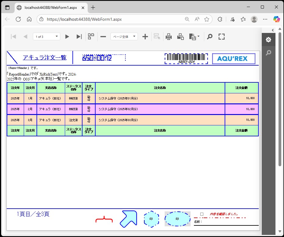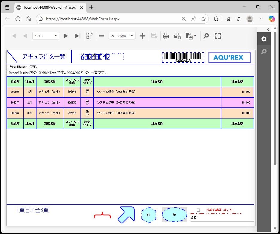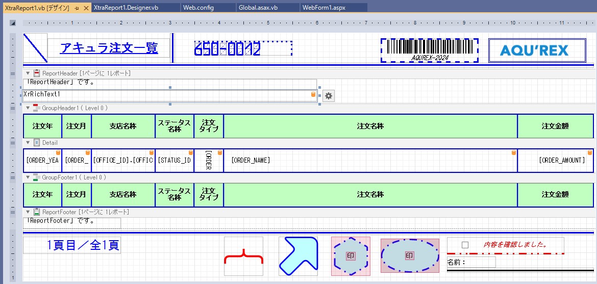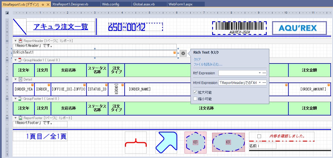 DevExpress での一覧、帳票等のレポート(ASPxWebDocumentViewer)のリッチテキスト情報(XRRichText)のテキストにフィールド設定のサンプルです。