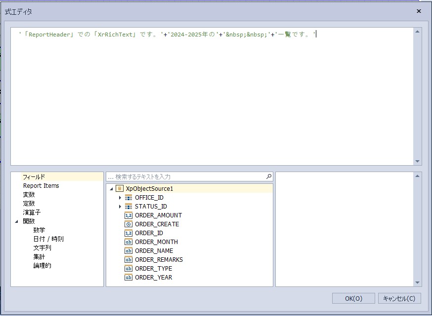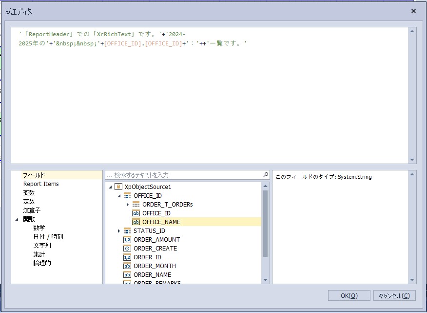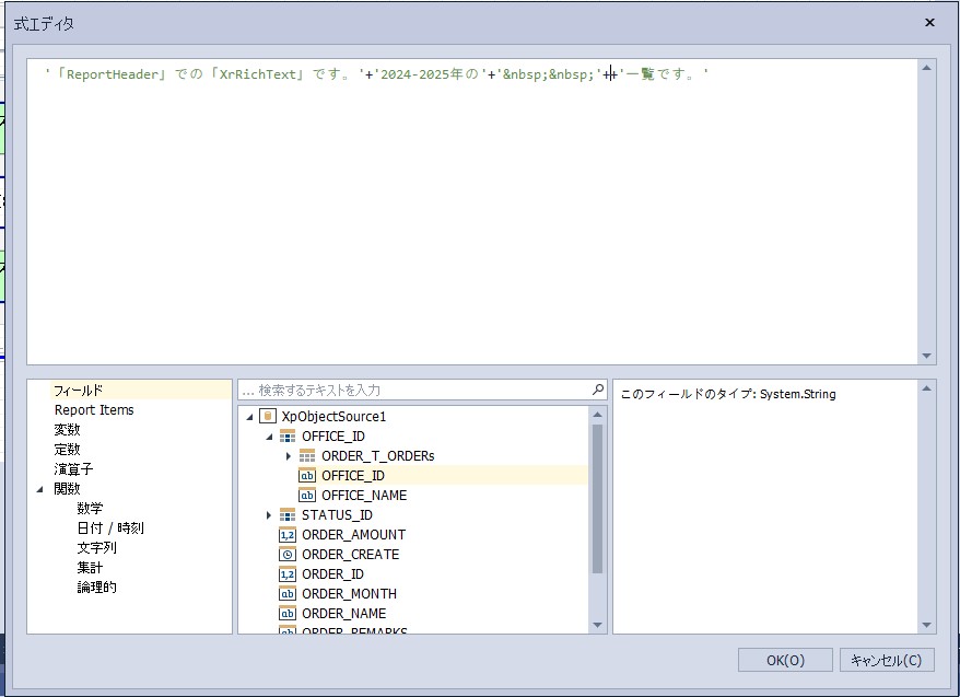 設定内容:‘「ReportHeader」での「XrRichText」です。’+’2024-2025年の’+’ ’+[OFFICE_ID].[OFFICE_ID]+’:’+[OFFICE_ID].[OFFICE_NAME]+’一覧です。’