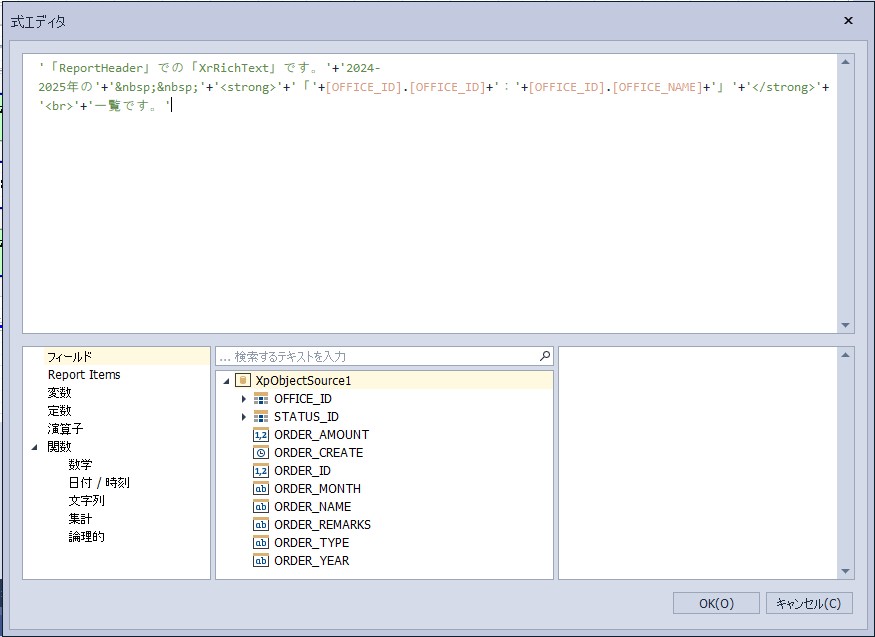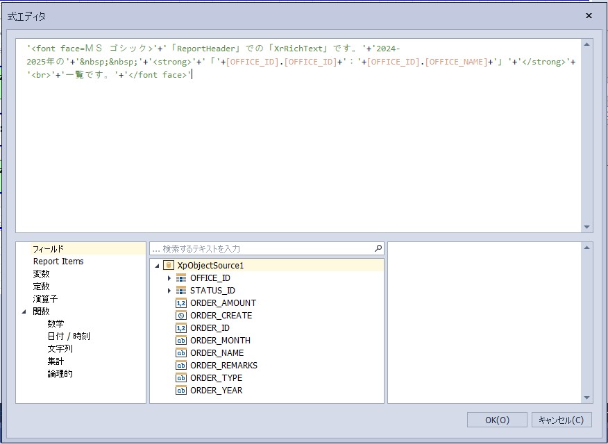設定内容:'<font face=MS ゴシック>’+’「ReportHeader」での「XrRichText」です。’+’2024-2025年の’+’ ’+'<strong>’+’「’+[OFFICE_ID].[OFFICE_ID]+’:’+[OFFICE_ID].[OFFICE_NAME]+’」’+'</strong>’+'<br>’+’一覧です。’+'</font>’