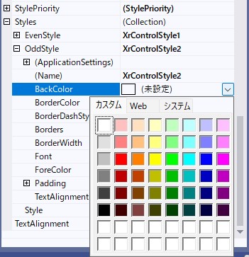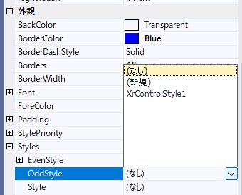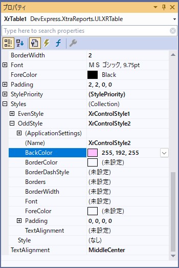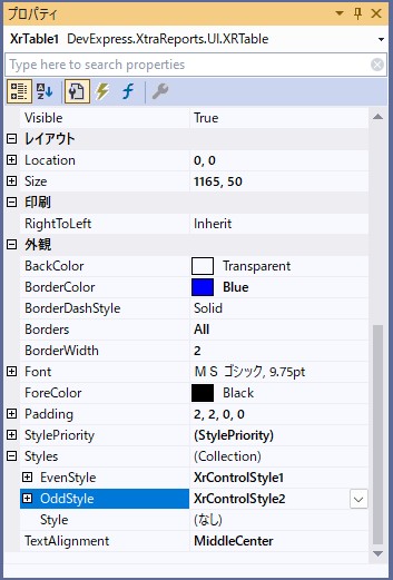 「XrTable1」のプロパティから「Me.XrTable1.OddStyleName = “XrControlStyle2″」を設定します。