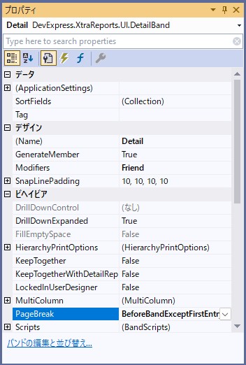 「Detail」のプロパティから「Me.Detail.PageBreak = DevExpress.XtraReports.UI.PageBreak.BeforeBandExceptFirstEntry」を設定します。