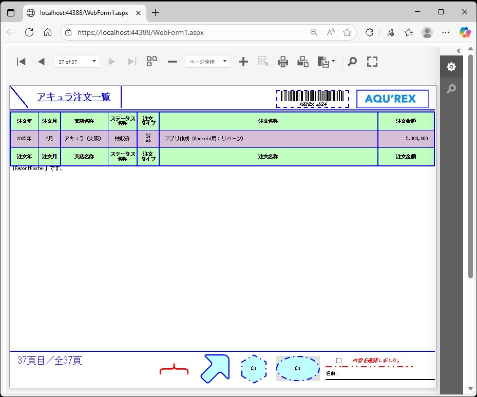 1レコードに対して、1ページ出力(1件1葉)のため、出力ページ数はレコード件数の37ページになります。
