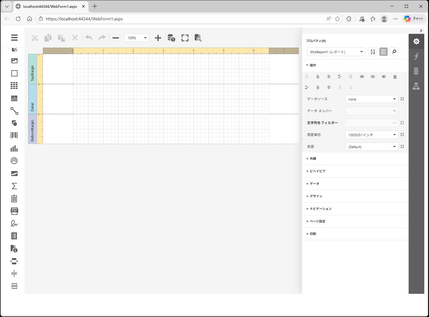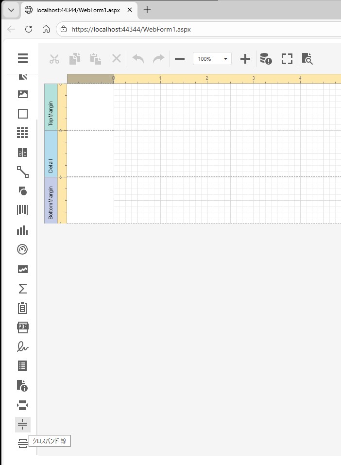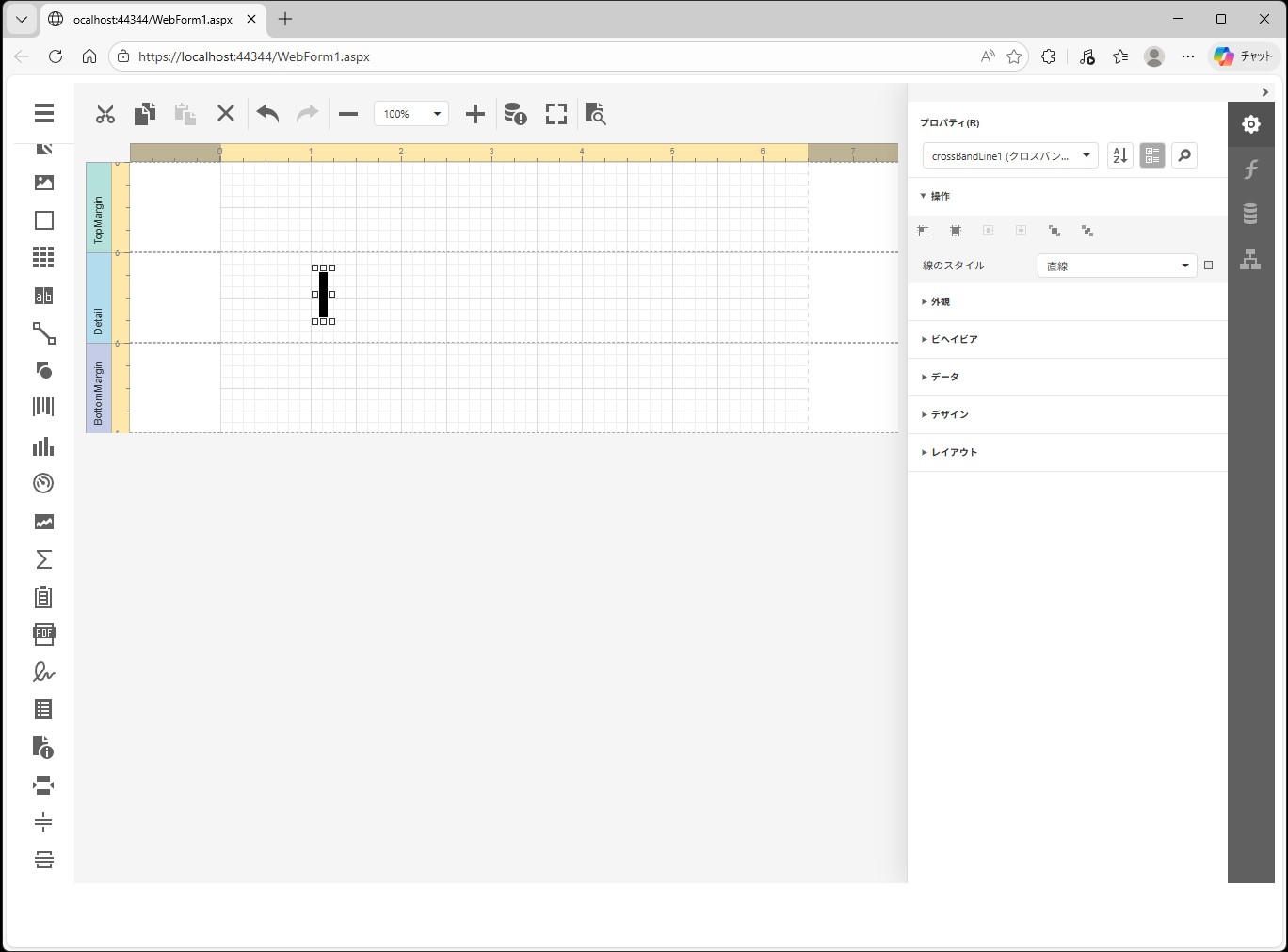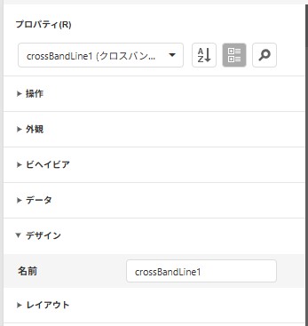 DevExpress での一覧、帳票等のレポートデザイナ(ASPxReportDesigner)のクロスバンド線(crossBandLine)配置手順です。