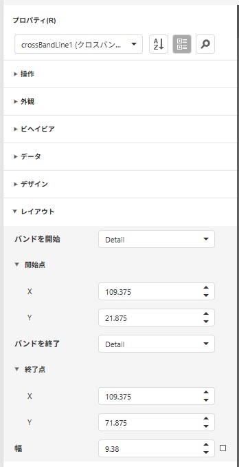 <レポートデザイナ(ASPxReportDesigner)のクロスバンド線(crossBandLine)配置>