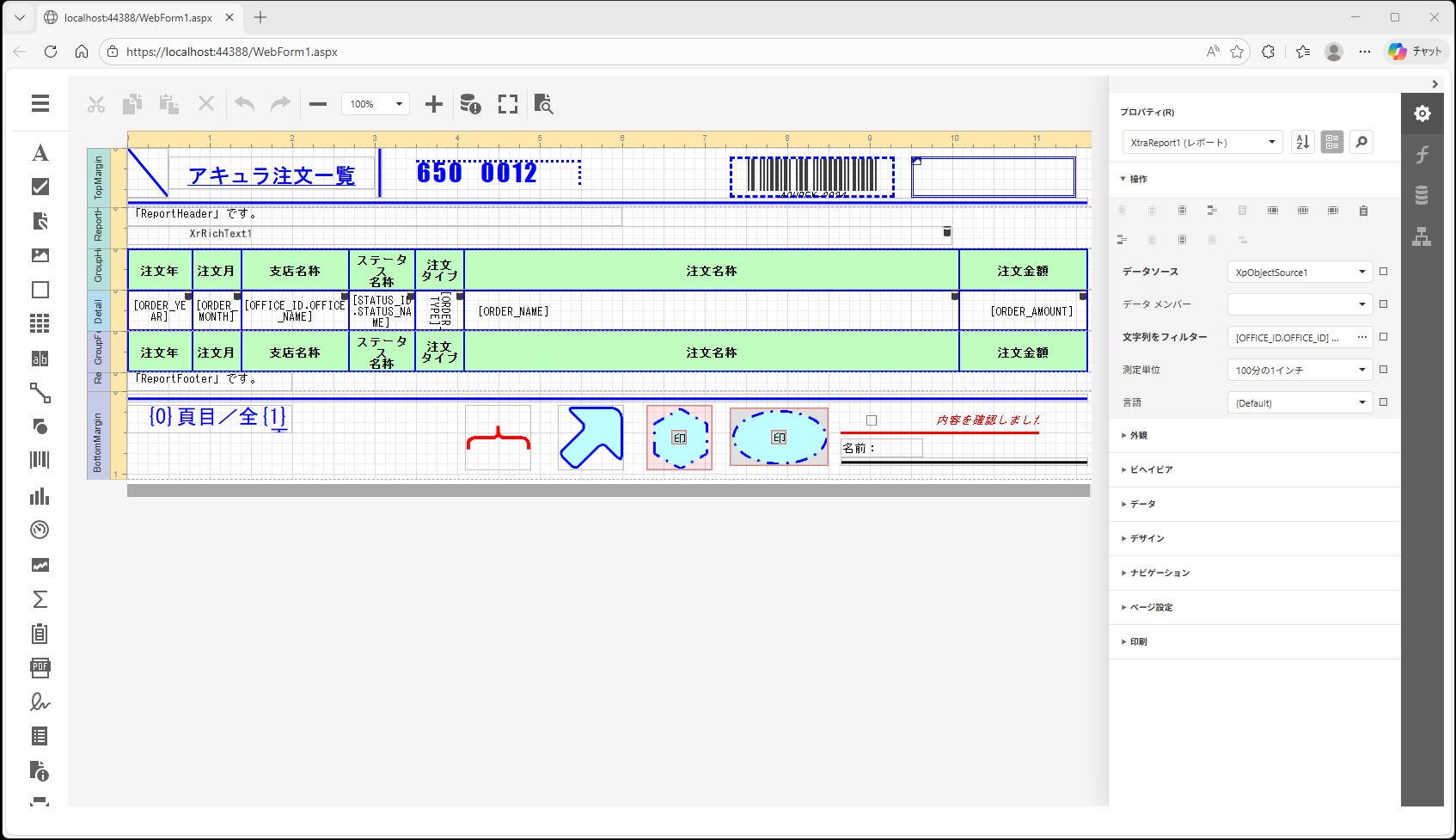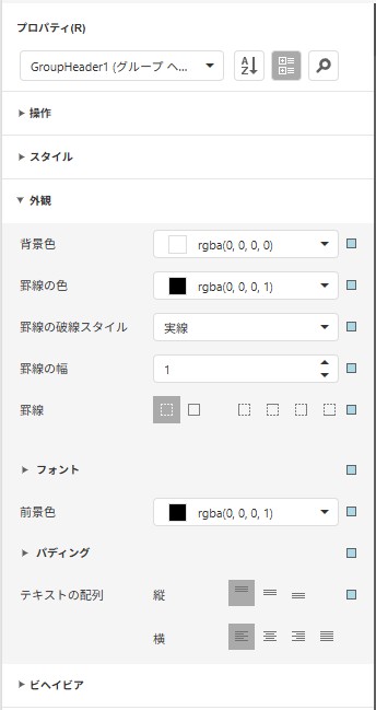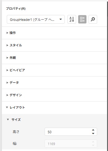 一覧、帳票等のレポートデザイナ(ASPxReportDesigner)のグループヘッダー領域(GroupHeader)設定になります。