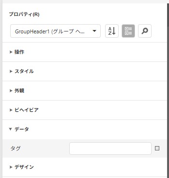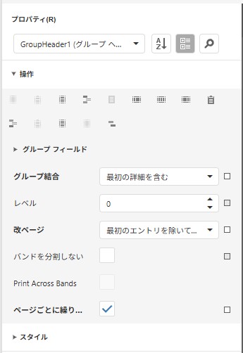 DevExpress での一覧、帳票等のレポートデザイナ(ASPxReportDesigner)のグループヘッダー領域(GroupHeader)設定です。