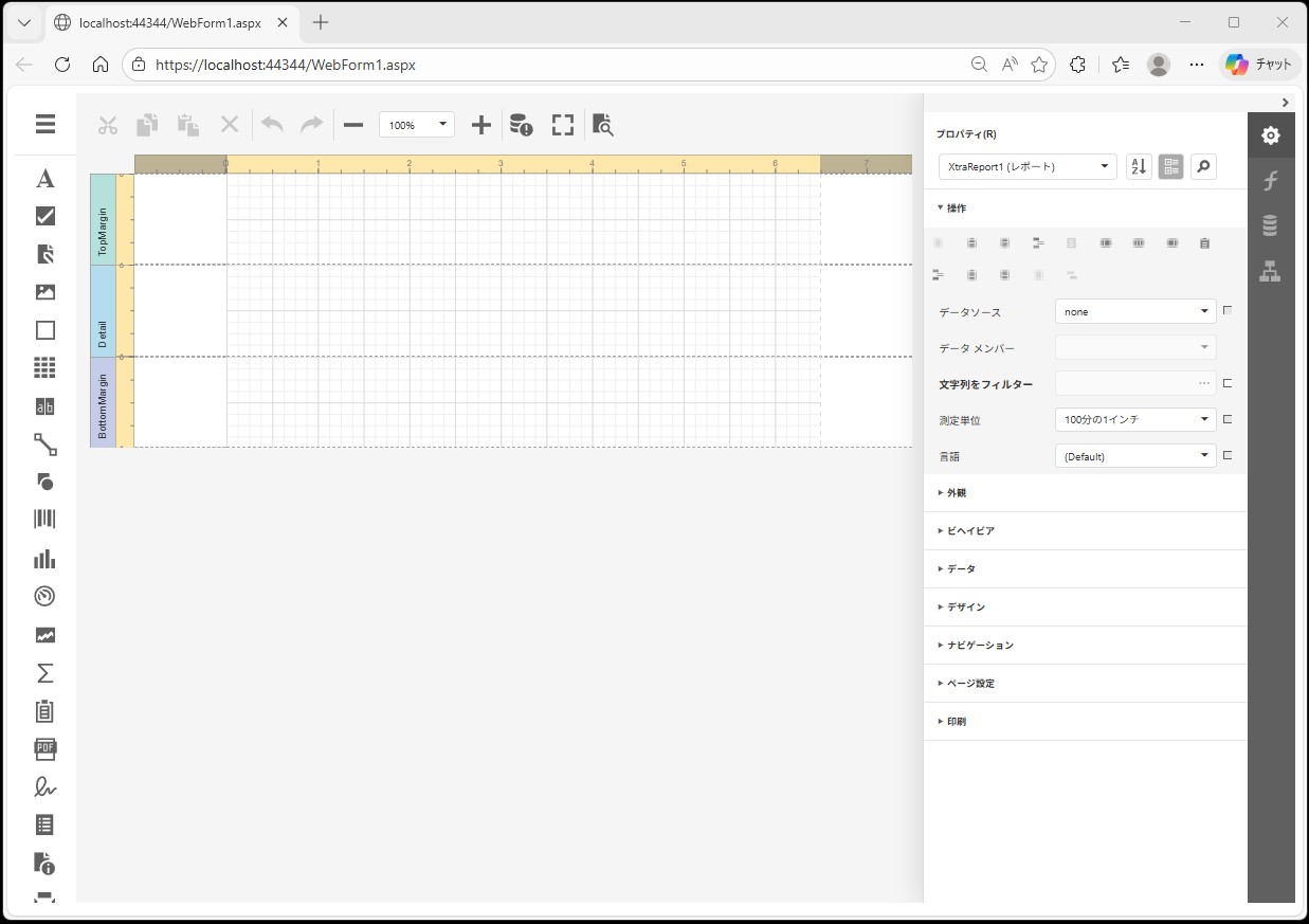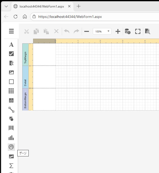 DevExpress での一覧、帳票等のレポートデザイナ(ASPxReportDesigner)のゲージ(gauge)配置手順です。