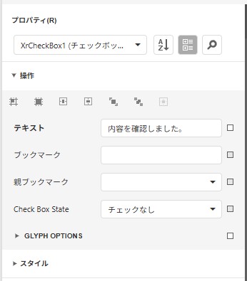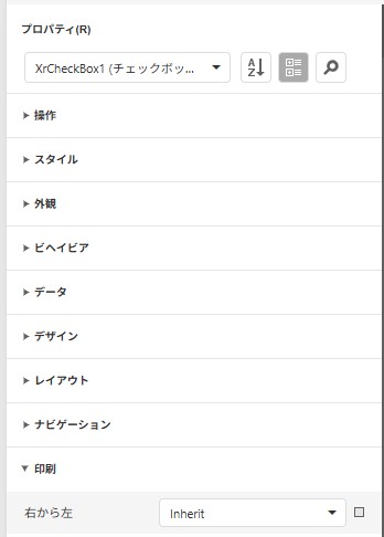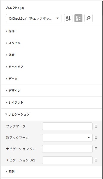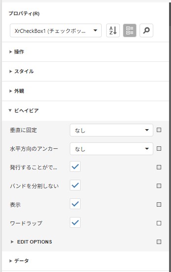 DevExpress での一覧、帳票等のレポートデザイナ(ASPxReportDesigner)のチェックボックス(CheckBox)設定です。