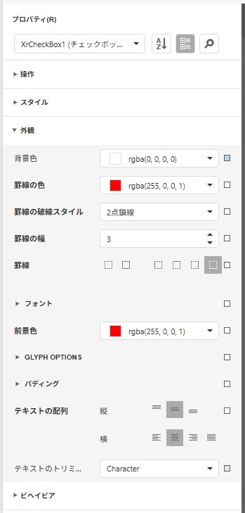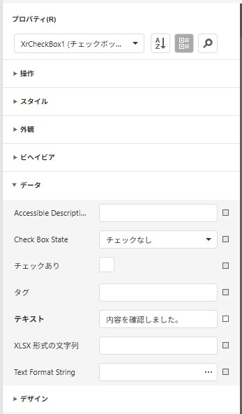 無事、一覧、帳票等のレポートデザイナ(ASPxReportDesigner)のチェックボックス(CheckBox)設定になります。