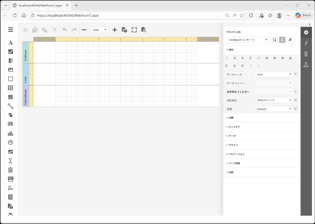 DevExpress での一覧、帳票等のレポートデザイナ(ASPxReportDesigner)のチェックボックス(checkBox)配置手順です。
