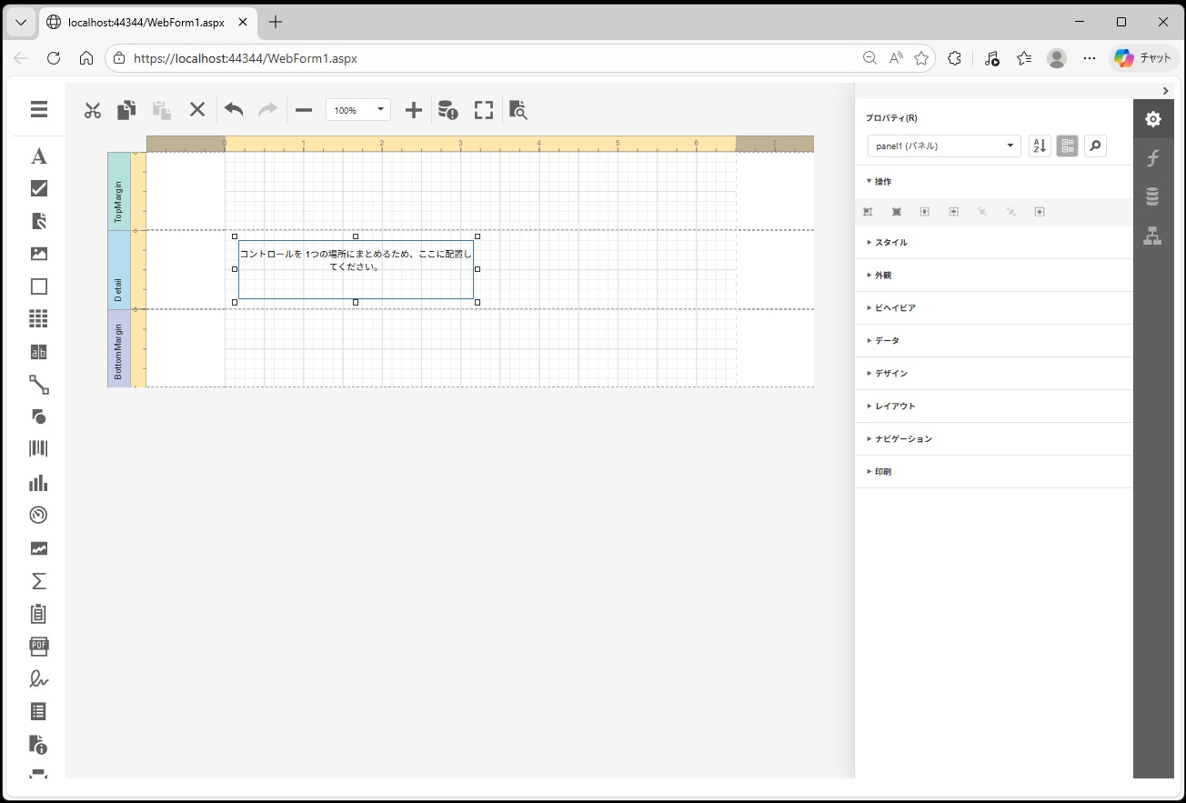 無事、一覧、帳票等のレポートデザイナ(ASPxReportDesigner)のパネル(panel)配置が出来ました。