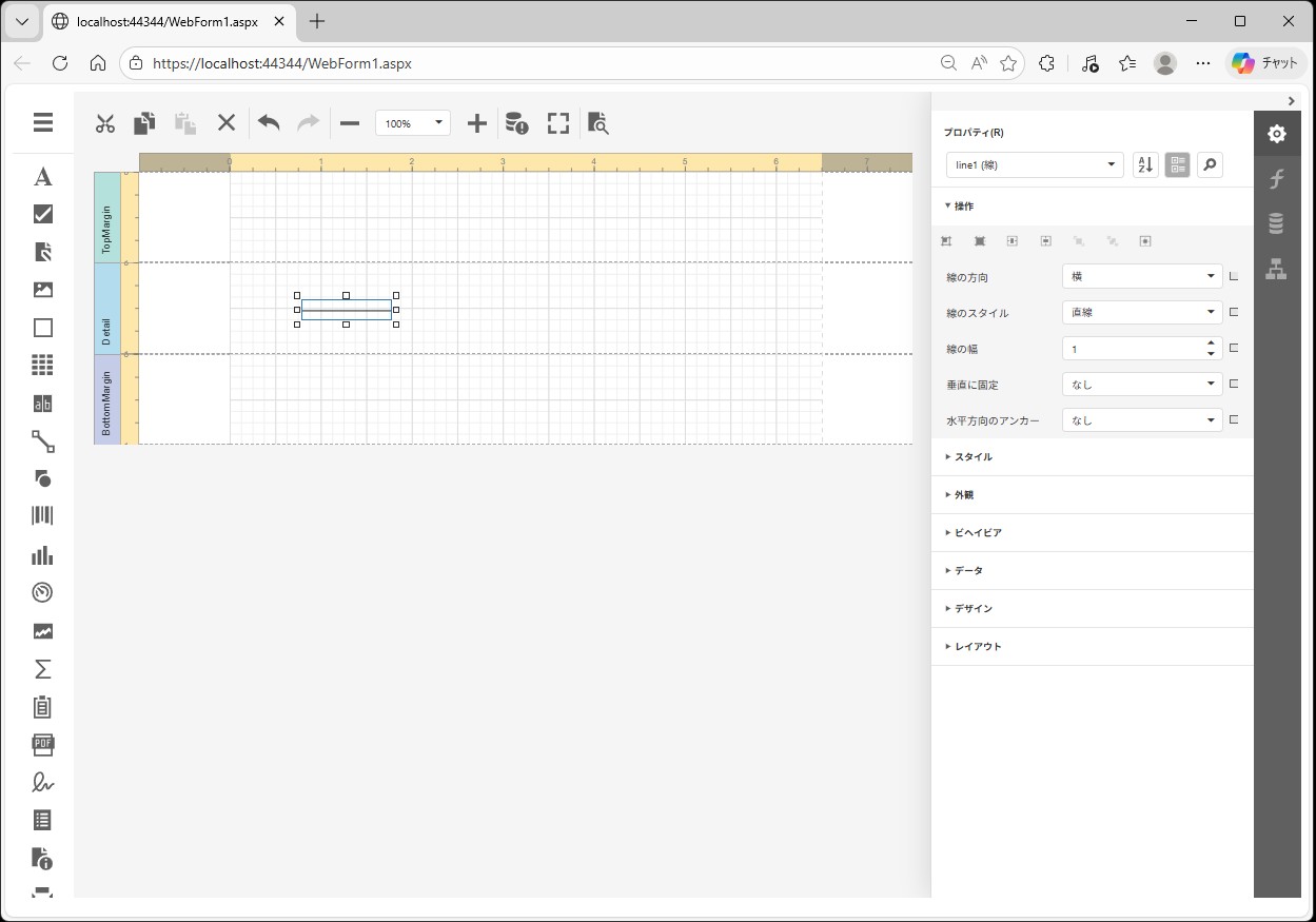 DevExpress での一覧、帳票等のレポートデザイナ(ASPxReportDesigner)の線(line)配置手順です。